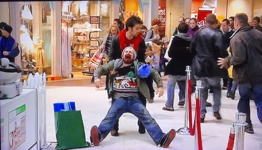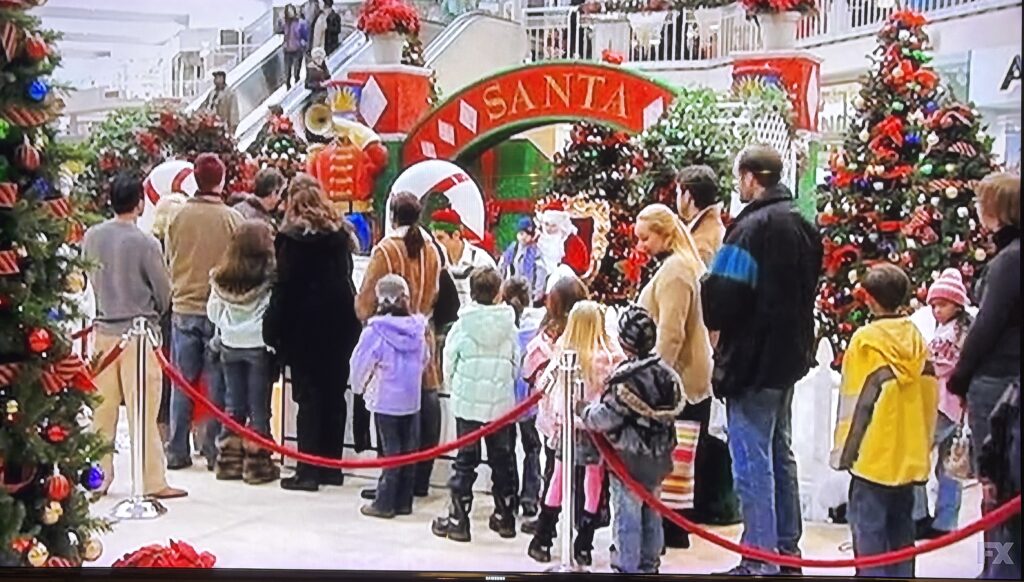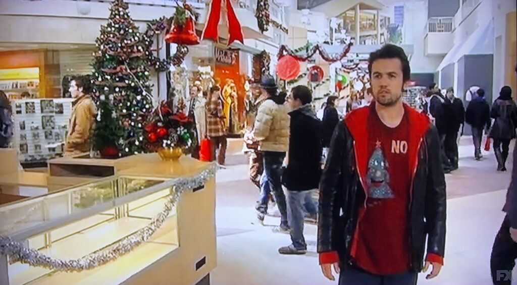 The Sunny crew are back at Westfield Culver City Mall (AKA Fox Hills Mall) in the exact location in the mall as “The Gang Runs For Office” in one of my all time favorite episodes, “A Very Sunny Christmas.” In this episode, Dennis and Dee decide to get even with Frank for past Christmas transgressions by giving him the “Christmas Carol” treatment. Meanwhile, Mac and Charlie try to relive their childhood Christmas memories only to realize they aren’t exactly as jolly as they remember.