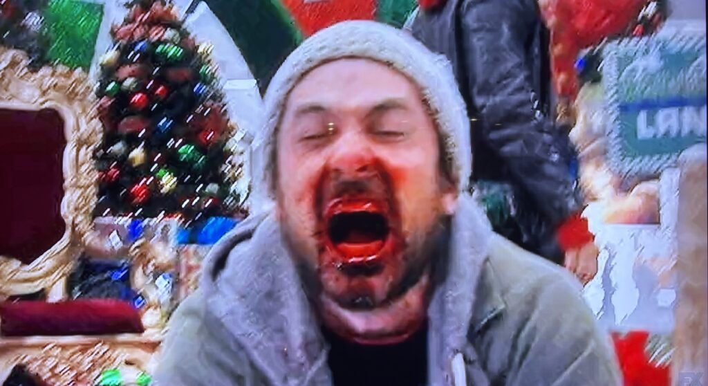Charlie’s reaction to Santa can best be described as an overreaction. The scene ends in mayhem with a bloody and gnarled Santa, a cannibal Charlie and a panicked Mac.
