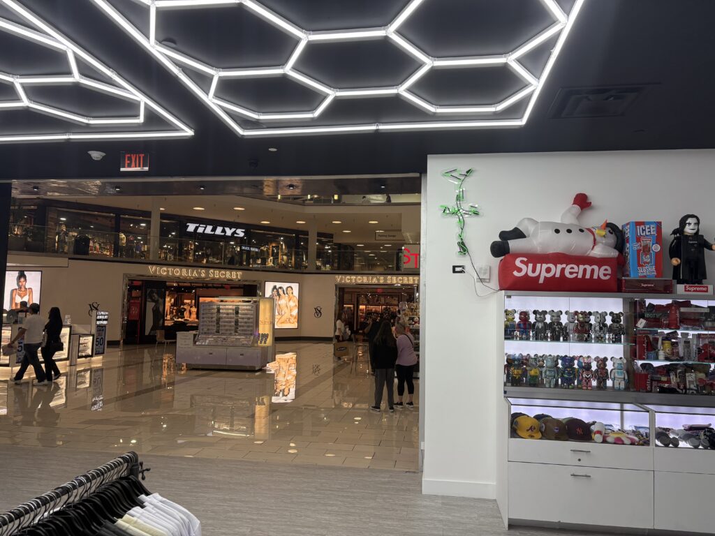 A sliver of the Victoria’s Secret sign can be seen behind Mac and Charlie. I believe this scene was filmed inside the store that is now Rundown LA. From inside Rundown, you get approximately the same view of the Victoria’s Secret sign. As you can see, the mall has been substantially renovated since 2010, as has Victoria’s Secret’s signage.